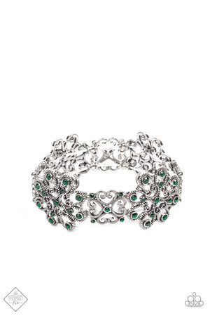 Regal Recognition Green Rhinestone and Silver Filigree Bracelet - Paparazzi Accessories