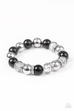 Oversized silver, smoky crystal-like, and polished black beads are threaded along a stretchy elastic band and wrapped around the wrist for a glamorous look. White rhinestone encrusted rings are sprinkled between the dramatic beads for a sparkling finish.