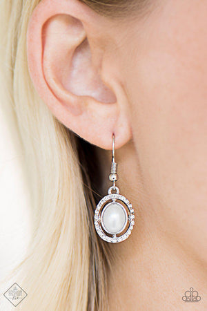 A pearly white bead is pressed into a white rhinestone encrusted frame, creating a dreamy frame. Earring attaches to a standard fishhook fitting.