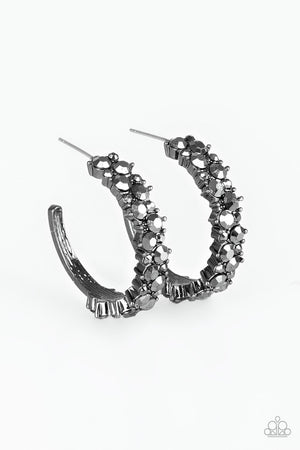 Encrusted in glassy hematite rhinestones, a thick gunmetal hoop curls around the ear for a glamorous look. Earring attaches to a standard post fitting. Hoop measures 1" in diameter.