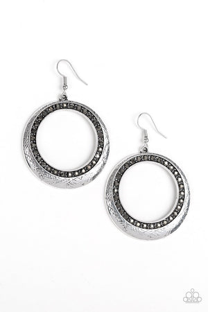 Delicately scratched in antiqued shimmer, a glistening silver hoop is encrusted in a ring of glittery hematite rhinestones for a refined look. Earring attaches to a standard fishhook fitting.