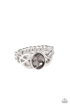 A smoky gem is pressed into the center of a shimmery silver band rippling in a filigree pattern for a refined look. Features a dainty stretchy band for a flexible fit.
