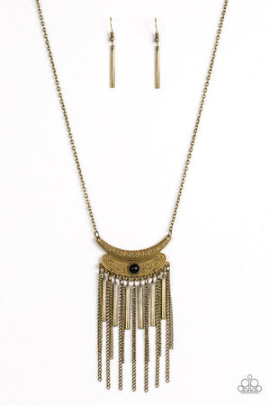 Embossed in vine-like patterns, a stacked brass pendant gives way to a shimmery brass fringe. Infused with an elongated brass chain, a dainty black bead is pressed into the center of the antiqued pendant for a colorful finish. Features an adjustable clasp closure.