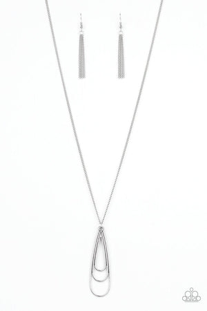 Gradually increasing in size, glistening silver teardrops coalesce into a rippling frame. The airy pendant swings from the bottom of a lengthened silver chain for an edgy look. Features an adjustable clasp closure.