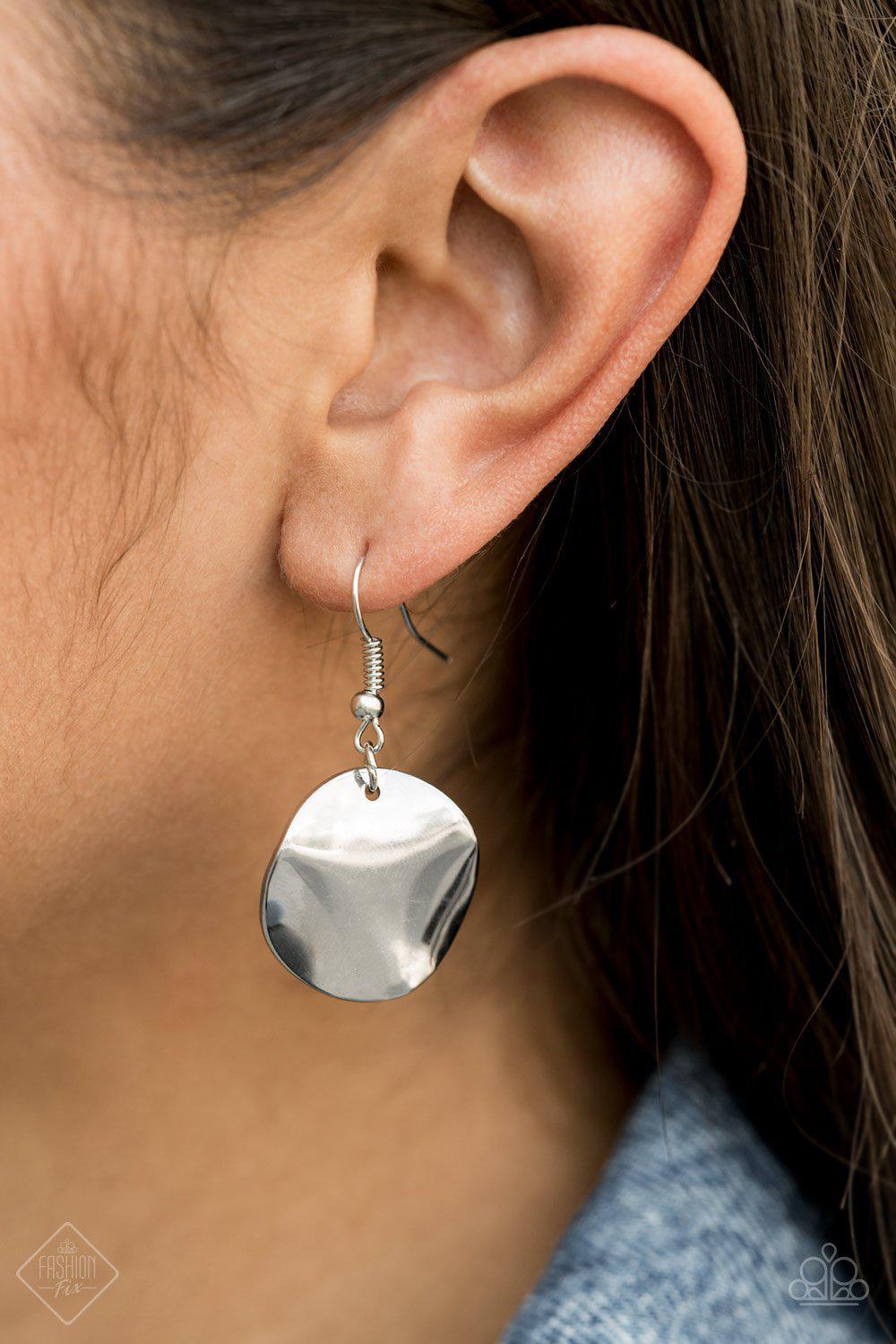 Featuring a galactic tie dye print, flat colorful discs swirled in tones of blue and purple combine with curved silver discs, swinging from the bottom of a bulky silver chain for a trendy throwback look. Features an adjustable clasp closure.