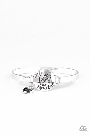 Infused with a classic black bead and dainty silver heart charm, shiny silver bars curl around the wrist and attach to a round centerpiece stamped in the inspirational phrase, "Trust In The Lord With All Your Heart". Features a hinged closure.