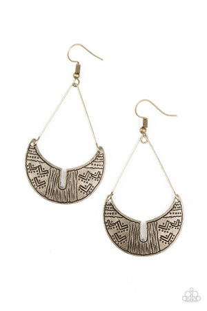Stamped in tribal inspired patterns, a brass crescent frame attaches to triangular bar fittings for an indigenous look. Earring attaches to a standard fishhook fitting.