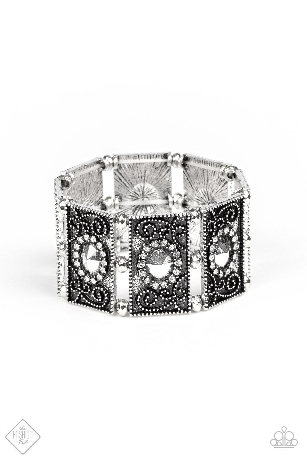 Featuring faceted silver beaded and white rhinestone encrusted centers, rectangular filigree filled silver frames are threaded along a stretchy band around the wrist for a vintage inspired look.