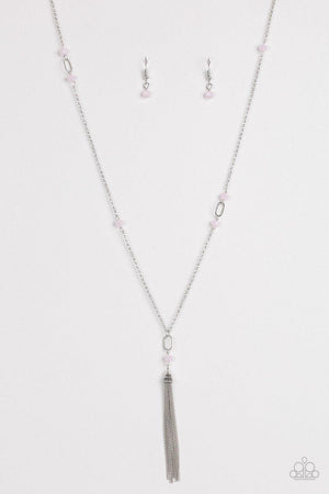 Dainty pink opaque beads and shimmery silver accents are sprinkled along an elongated silver chain. A shimmery silver tassel swings from the bottom, adding a wanderlust finish to the whimsical palette. Features an adjustable clasp closure.