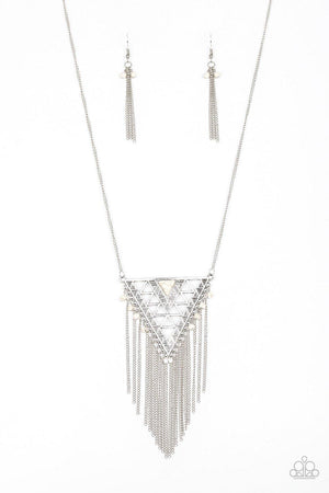 Stamped in geometric patterns, an airy triangular pendant swings from the bottom of a lengthened silver chain. Infused with a refreshing white stone, the tribal inspired pendant gives way to shimmery silver chains and dainty stone beads for a wanderlust finish. Features an adjustable clasp closure.