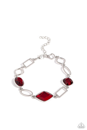 Oval, rectangular, and asymmetrical silver links connect with a trio of glittery red gems around the wrist, resulting in an endless dazzle. Features an adjustable clasp closure.