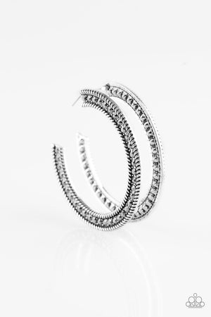 HAUTE Mama Silver and Hematite Rhinestone Hoop Earrings - Paparazzi Accessories