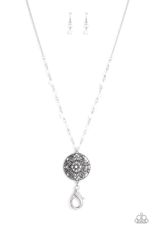 A collection of glassy and opaque white beads trickle down the bottom of a lengthened silver chain. Dotted with opalescent white rhinestones, a floral medallion-like pendant swings from the bottom for a whimsical finish. A lobster clasp hangs from the bottom of the design to allow a name badge or other item to be attached. Features an adjustable clasp closure.
