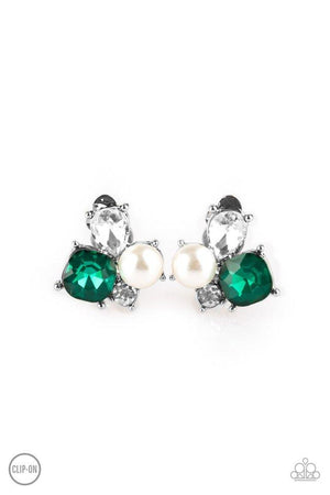 Highly High-Class Green and White Rhinestone Clip-On Earrings - Paparazzi Accessories