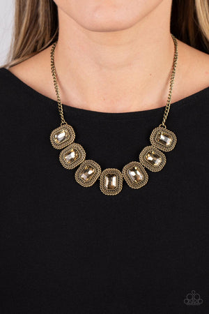Pressed into rectangular brass frames, radiant-cut rhinestones in a warm, golden undertone smolder below the collar. Each frame is embellished with twisted texture and subtle brass studs, bringing a gritty contrast to the design. Features an adjustable clasp closure.