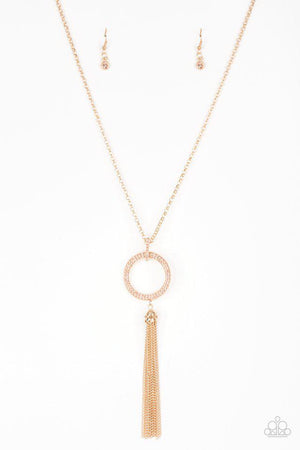 Encrusted in dazzling peach rhinestones, a shimmery gold hoop swings from the bottom of an elegantly elongated gold chain for a refined look. A glistening gold tassel swings from the bottom of the glittery pendant for a flirty flair. Features an adjustable clasp closure.