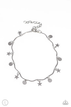 A fringe of sleek silver stars and discs swings from a dainty silver overlay chain, creating whimsical movement around the ankle. Features an adjustable clasp closure.