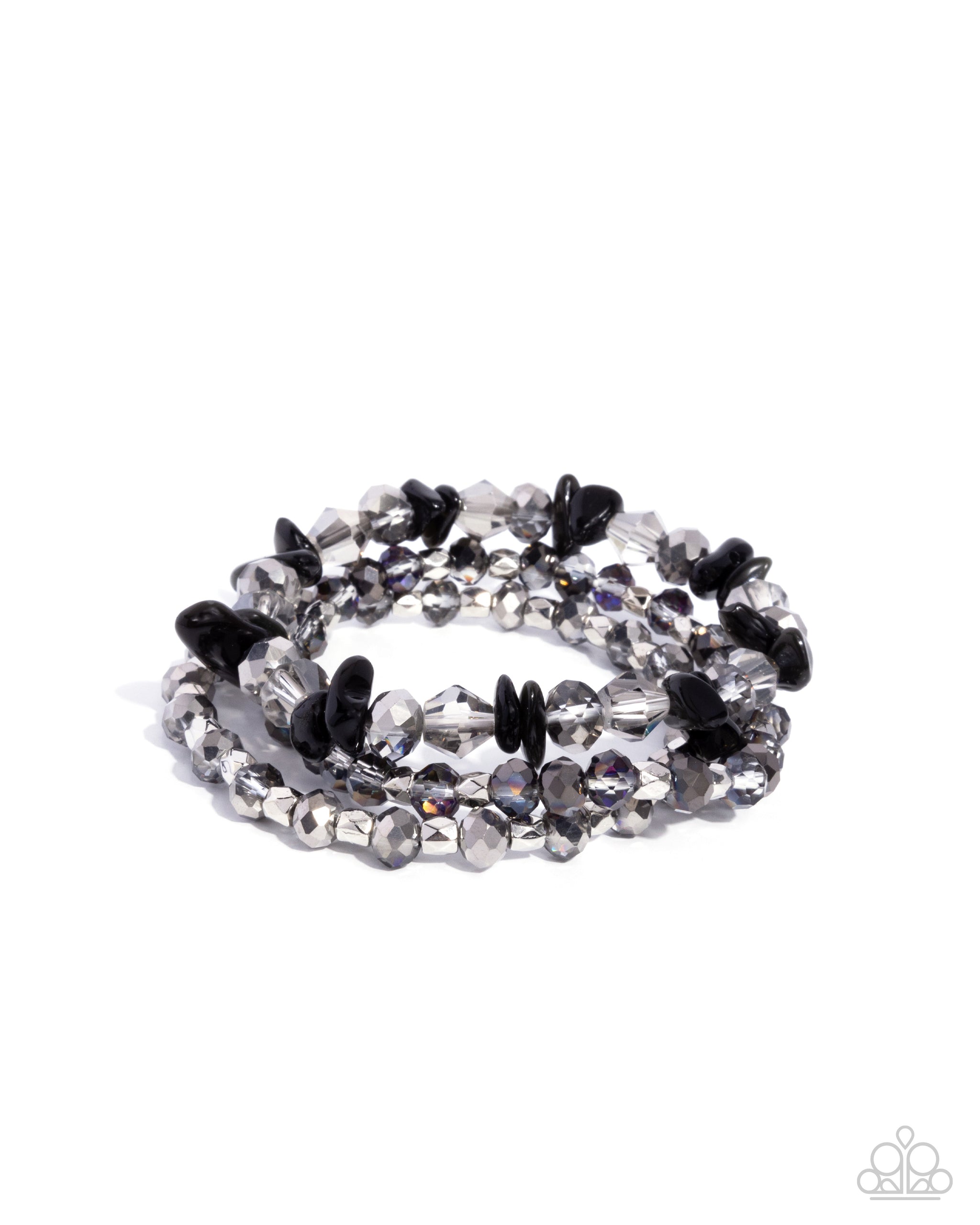 A trio of stretchy bracelets, embellished with faceted smoky, silver, and hematite beads glisten around the wrist. Clusters of pebble-like black stones are interspersed, creating a striking contrast between the reflective beads and solid, bold accents.