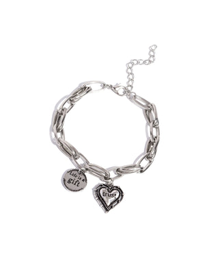Swinging along a silver paperclip chain, two stud-embellished silver pendants, one a circle and the other a heart, feature the stamped phrase "Life is a gift" and the stamped word "trust" for an optimistically opulent display. Features an adjustable clasp closure.