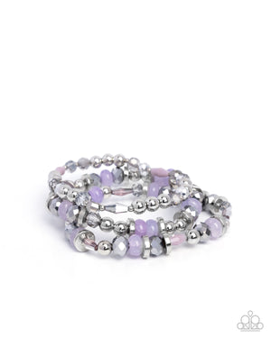 A blend of soft purple and metallic silver beads in a variety of shapes and finishes intermingle with textured silver accents, creating a layered look of understated elegance. Hints of translucent and iridescent finishes add depth and dimension, making this set a versatile accessory.