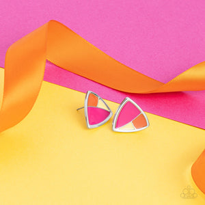 A collision of Daffodil, Innuendo, and orange painted accents beam inside an asymmetric triangular frame for a contemporary pop of color. Earring attaches to a standard post fitting.