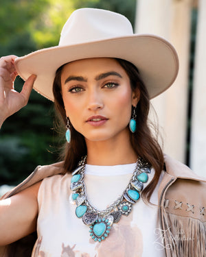Whimsically patterned silver hearts stamped in textured filigree, dance along a thick silver chain around the neck, clustering into a romantic fringe. Additional turquoise stone-detailed silver hearts in varying sizes are sprinkled along the chain–adding texture and depth–further highlighting the spectrum of texture at play. Features an adjustable clasp closure. As the stone elements in this piece are natural, some color variation is normal.