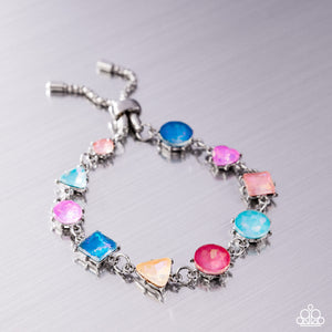Encased in pronged silver frames, faceted, elevated, opalescent multicolored gems in varying cuts shimmer around the wrist for a colorful couture look. Features an adjustable sliding knot closure.