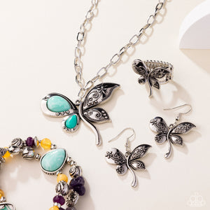 Fluttering below a silver paperclip chain, an abstract, elongated silver dragonfly, featuring mismatched wings cascades below the neckline for a mystical finish. Featured on the left wings, a collection of tactile whimsical motifs are embossed atop silver-studded borders, while varying sizes of teardrop green-marbled stones pressed in silver stud-dotted wings create the right side for an eye-catching eclectic finish. Features an adjustable clasp closure. As the stone elements in this piece are natural, some color variation is normal.