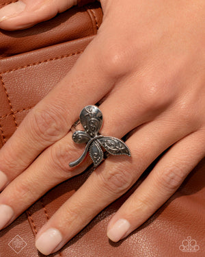 Fluttering atop airy silver bands atop the center of the finger, an elongated silver dragonfly with a mismatched display of studded, curled, and rounded teardrop silver wings each embossed with various tactile whimsical motifs catches the eye for an eclectic display. Features a stretchy band for a flexible fit.