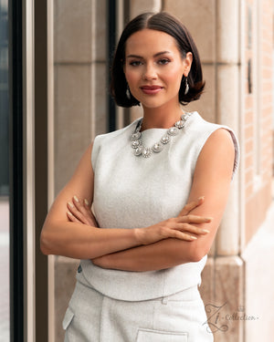 Classic white rhinestones in various dimensions create majestic petals that encircle and bloom from spellbinding, oversized white gem centers. Gradually differentiated in layers and impact, the twinkling floral frames sparkle and glitter below the collar as they delicately link into a fabulous floral statement piece. Features an adjustable clasp closure.