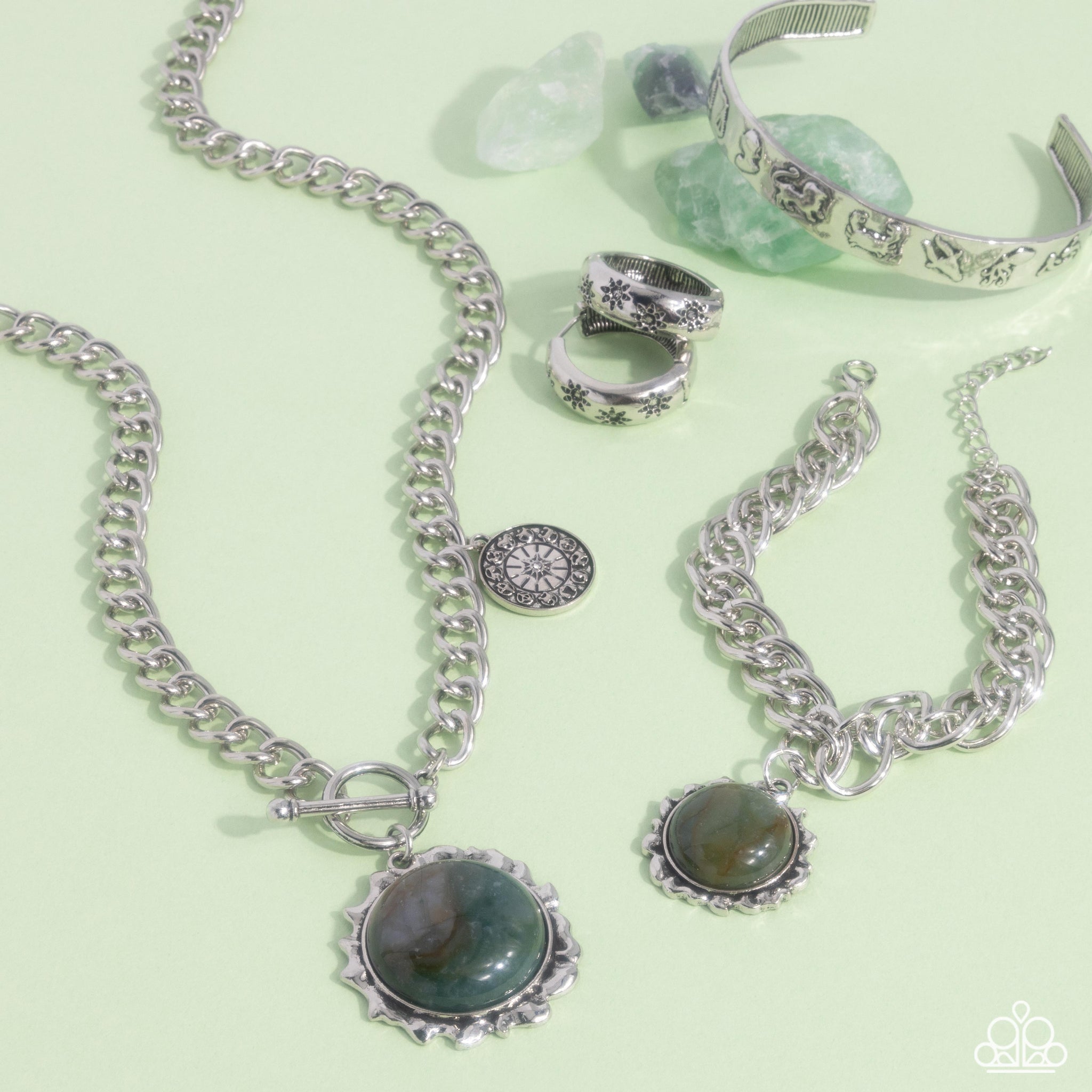 Set in a silver sun-bordered frame, a round green marbled stone radiates from a thick silver chain below the neckline. Stamped with the zodiac chart, an antiqued silver pendant swings along the chain above the stone for an astrological finish. Features a toggle closure. As the stone elements in this piece are natural, some color variation is normal.