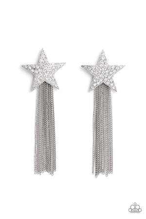 A curtain of silver chains streams out from the bottom of an oversized silver star encrusted in blinding white rhinestones, resulting in a stellar tassel. Earring attaches to a standard post fitting.