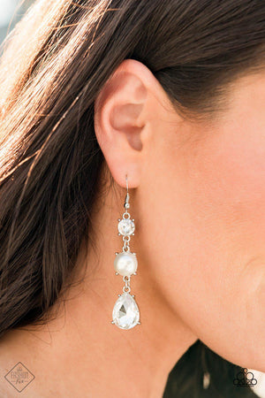 An oversized white teardrop gem swings from the bottom of a stacked pearly white bead and classic white rhinestone, creating a timeless lure. Earring attaches to a standard fishhook fitting.