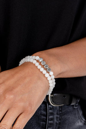 Cloudy beads in subtle shades of white extend around the wrist on elastic stretchy bands for a two-for-one romantic stack. Centered on one of the white bracelets, silver discs stamped with individual black letters spell out the word "love."