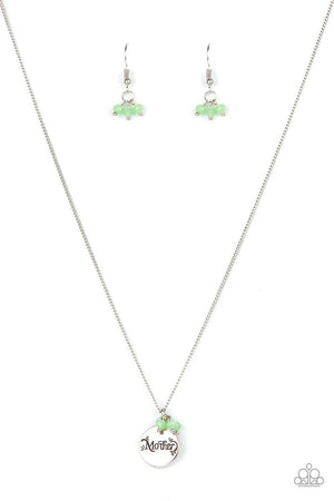 A dainty cluster of opaque Green Ash beads delicately joins a shiny silver disc stamped in the word, "Mother," along a classic silver chain, creating a whimsical pendant below the collar. Features an adjustable clasp closure.