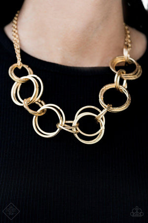 Delicately hammered in hints of shimmer, doubled and tripled gold hoops link below the collar for a bold industrial look. Features an adjustable clasp closure. Includes one pair of matching earrings.