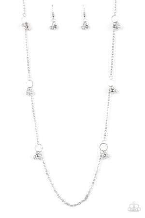 Clusters of silver beads and white pearls swing from dainty silver hoops along an elongated silver chain for an elegant look. Features an adjustable clasp closure.