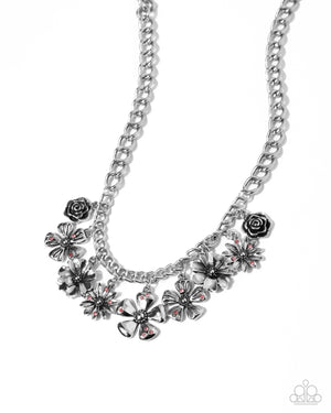 An array of intricately detailed flower charms, are strung along a bold silver curb chain. Several of the flowers are accented with sparkling pink rhinestones, adding a touch of elegance and shimmer to the whimsical design. The lifelike details of the textured petals bring a nature-inspired flair to the necklace. Features an adjustable clasp closure.