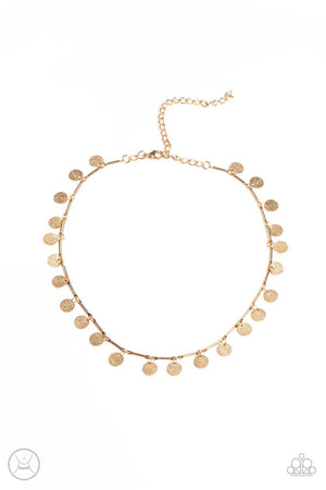 Hammered gold discs swing from interconnected gold bars around the neck, creating a shimmery fringe. Features an adjustable clasp closure.