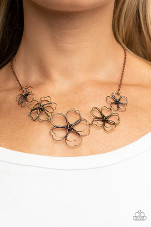 Rustic copper and brass wires delicately twist into oversized blossoms. Gradually increasing in size, the 3D frames elegantly pop beneath the collar. Features an adjustable clasp closure.