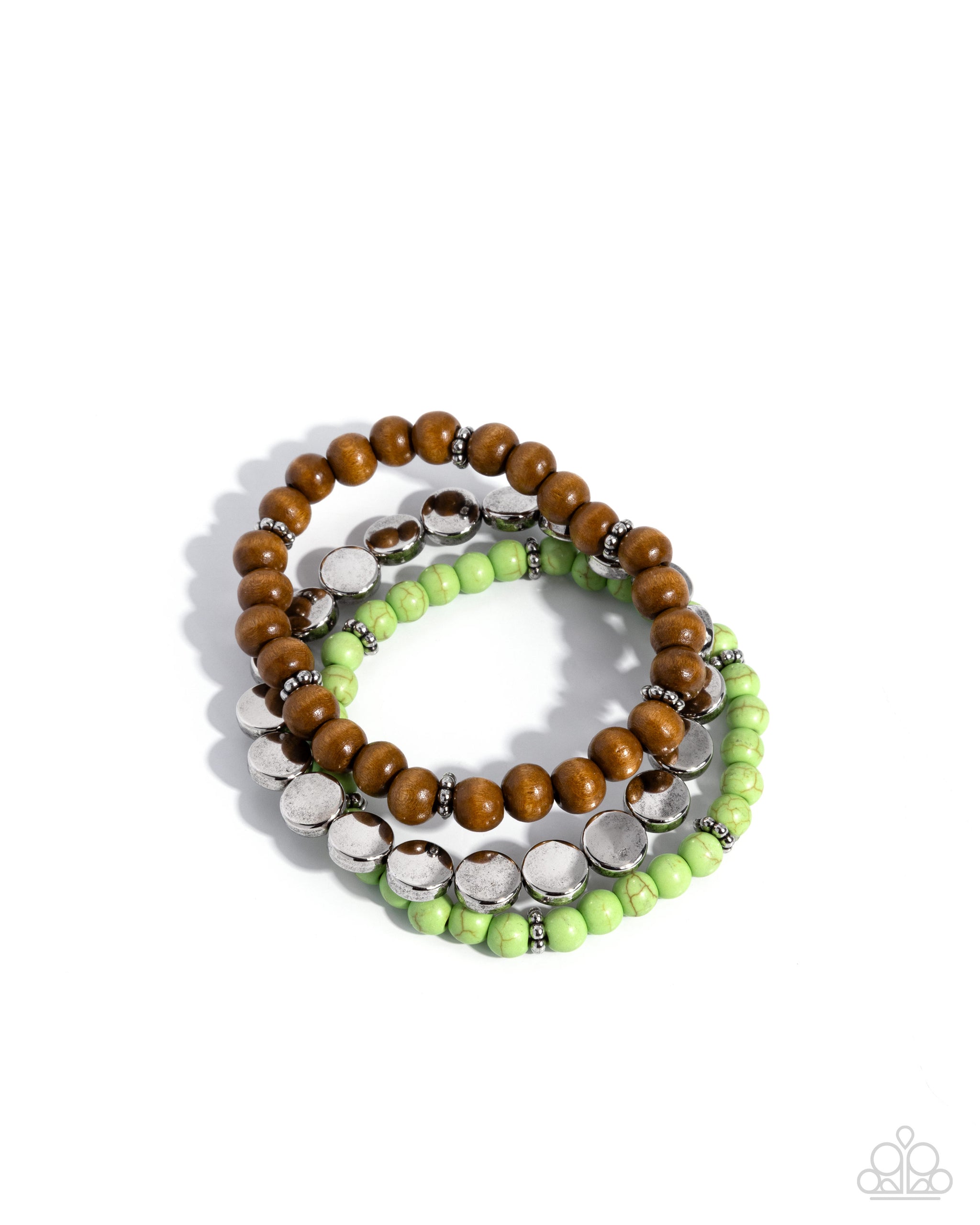 Infused along elastic stretchy bands, a collection of high-sheen silver discs, silver floral beads, marbled apple green stone beads, and light brown wood beads, stack atop the wrist for an eclectically earthy medley. As the stone elements in this piece are natural, some color variation is normal.