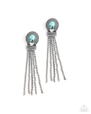 Featuring a black-marbled effect, a light green turquoise-like stone nestled in an intricately textured silver frame adds a touch of Western-inspired chic to any look. Multiple strands of silver chains cascade from the base, creating an elegant and dynamic fringe. Earring attaches to a standard post fitting. As the stone elements in this piece are natural, some color variation is normal.
