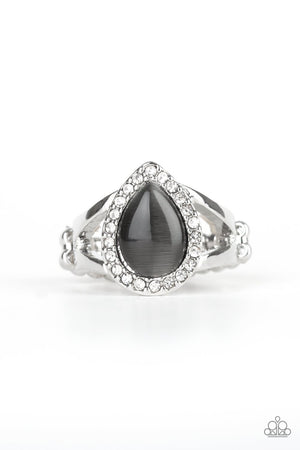 A smoky cat's eye teardrop is pressed into a glistening silver frame encrusted in glassy white rhinestones, creating a refined frame atop the finger. Features a dainty stretchy band for a flexible fit.