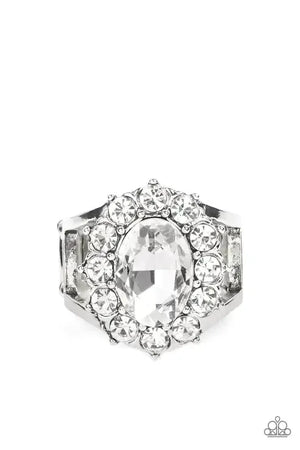 A dauntless oval rhinestone is encircled by dainty sparkling gems. Accented with petite antiqued silver studs, the dramatic design joins with an airy layered silver band to create a captivating arrangement atop the finger. Features a stretchy band for a flexible fit.