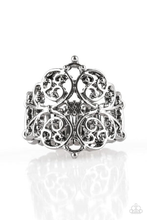 Brushed in a glistening finish, shimmery gunmetal filigree vines curl across the finger, coalescing into an airy frame for a vintage-inspired look. Features a stretchy band for a flexible fit.