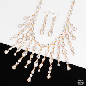 A stunning array of glitzy, white rhinestones are pressed into radiant gold frames, linking around the collar in vintage resplendence. The strand of round and marquise-cut gems gives way to a fringe of uncompromising sparkle, with teardrops and classic solitaires dotting the cascade. The back of each golden frame is rounded, elevating each sparkling gem and maximizing its prismatic potential. Features an adjustable clasp closure.
