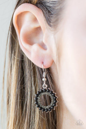 Dainty black beads circle around a ring of smoky rhinestones, creating an elegant frame. Earring attaches to a standard fishhook fitting.
