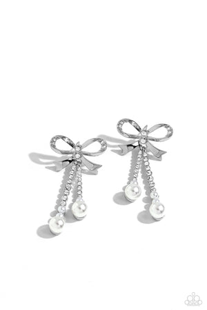 Bodacious Bow White Rhinestone & Pearl Bow Earrings - Paparazzi Accessories