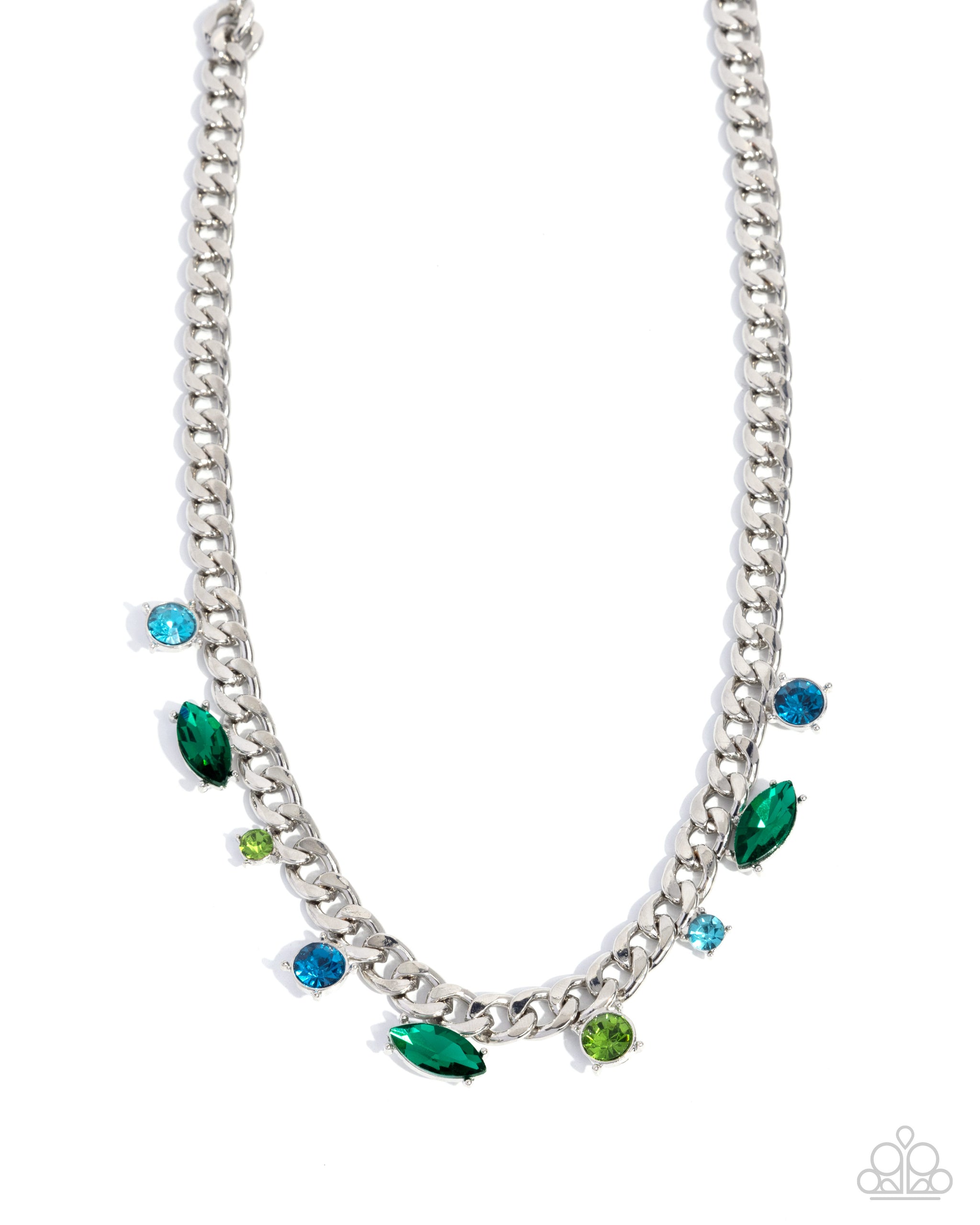 A bold silver chain is accented with a collection of green and blue rhinestones in various shapes and sizes, including marquise and round cuts, that are delicately suspended along the links. The varying shades of green and blue create a vibrant and striking design that adds a pop of color to any outfit. Features an adjustable clasp closure.