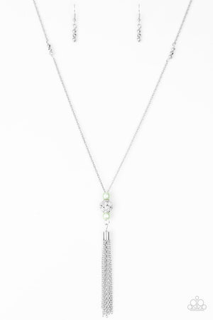 Infused with faceted silver accents, pearly green beads and a silver bead encrusted in glittery white rhinestones slide along a shimmery silver chain, creating an elegant centerpiece. A glistening silver tassel swings from the bottom of the refined pendant for a timeless finish. Features an adjustable clasp closure.